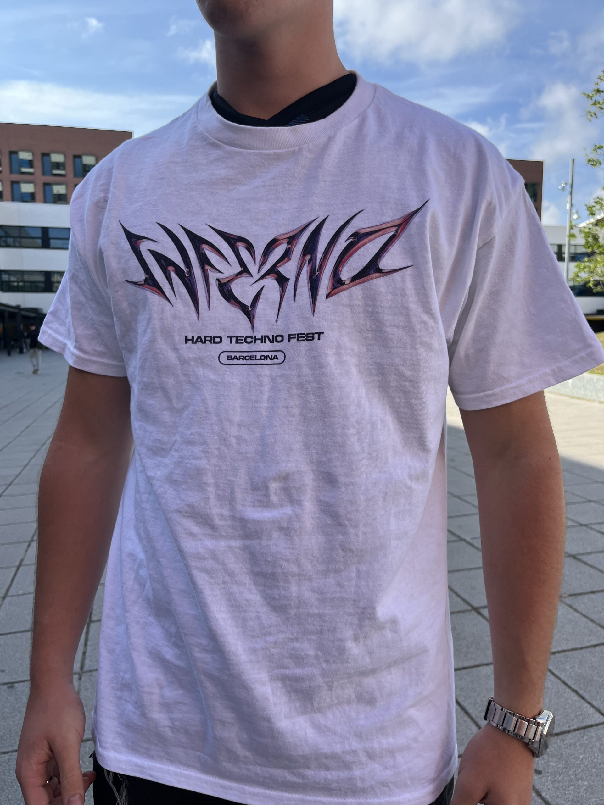 Merchandising oficial del festival, camiseta con logotipo y frase » hard techno fest» por delante y por detrás símbolo del festival, 100% de algodón. Disponible en color blanco y en tallas de la XS a la XL.